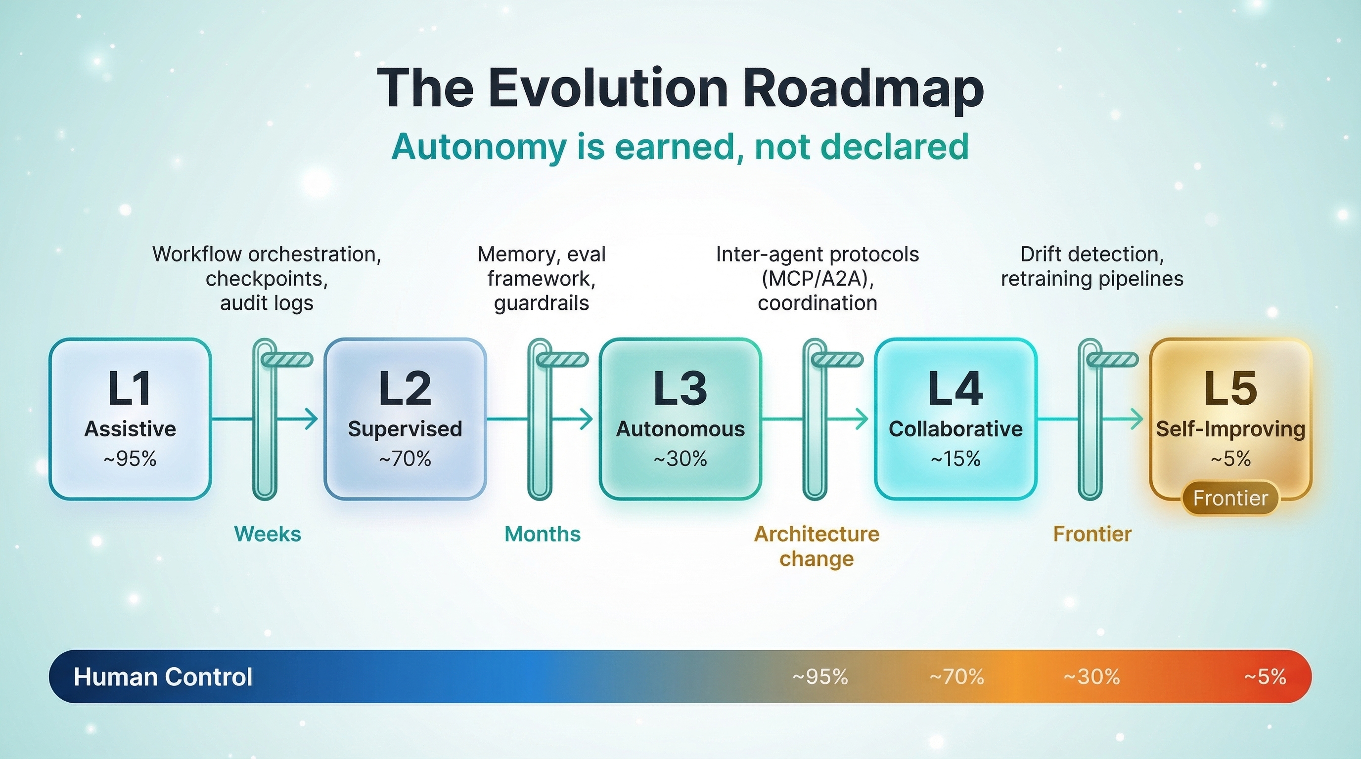 - L5 (Self-Improving) is the frontier. Understanding it now shapes how you architect L3-L4 for future evolution. Build for where you're going, not just where you are.